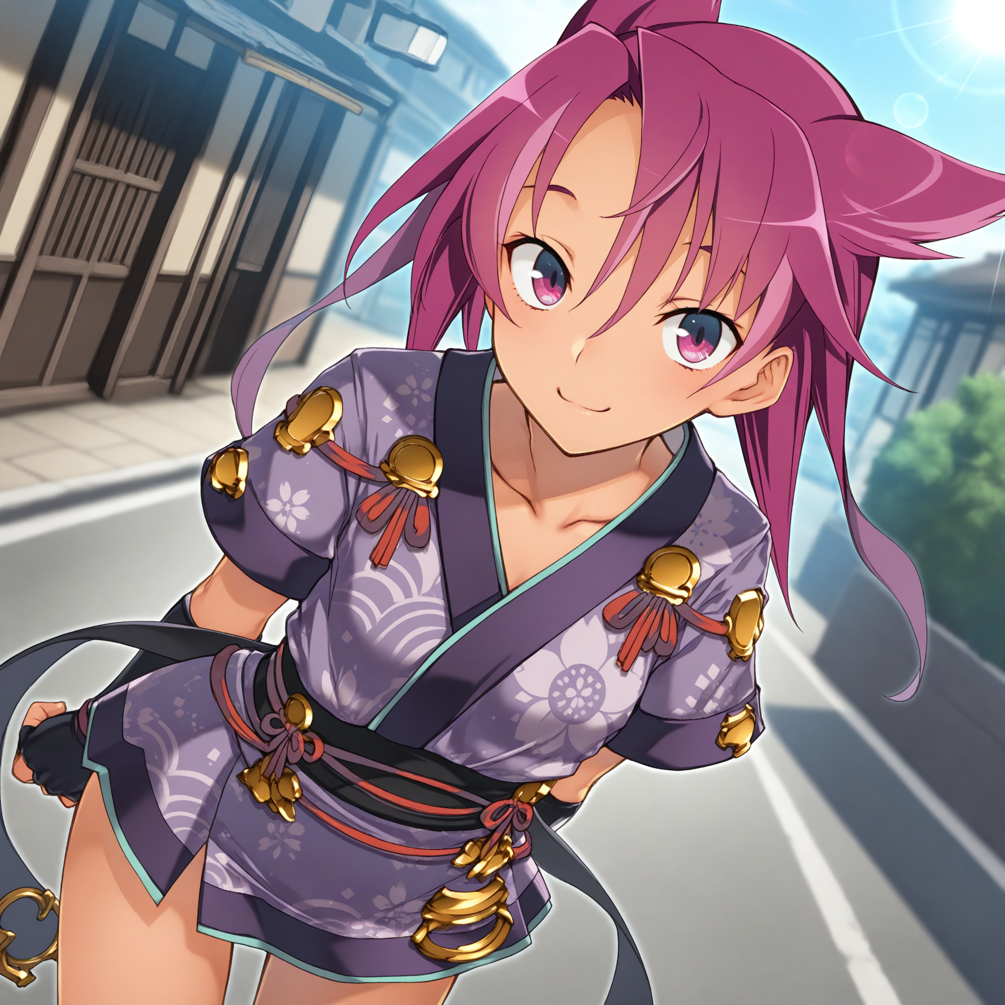 일본 옷, 보라색 기모노, 짧은 기모노, 짧은 소매, 손가락 없는 장갑, 검은 장갑, 띠, 오비,