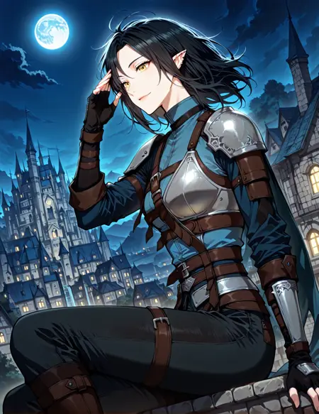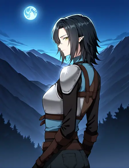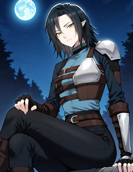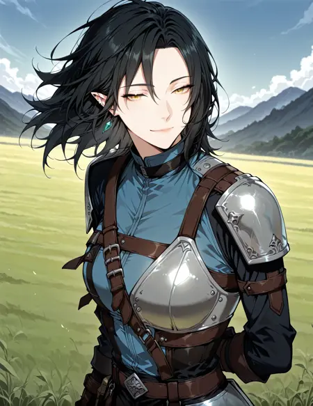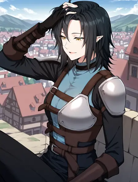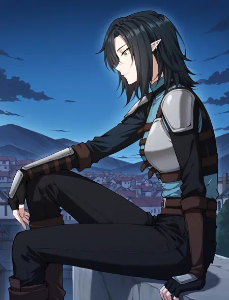 1 girl, solo, elf, pointy ears, black hair, medium hair, yellow eyes, blue shirt, pants, fingerless gloves, armor, shoulder armor, belt, ear piercing