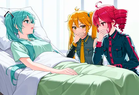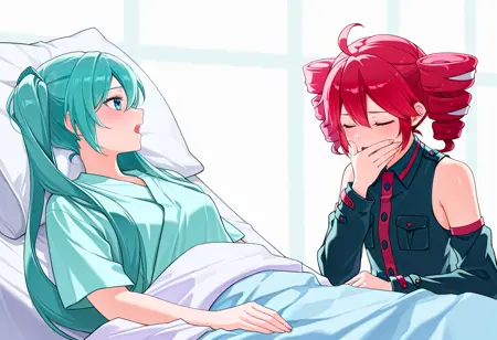 Trigger word: character 1, pillow, under covers, open mouth, lying, character 2, sitting, covering own mouth, hand over own mouth