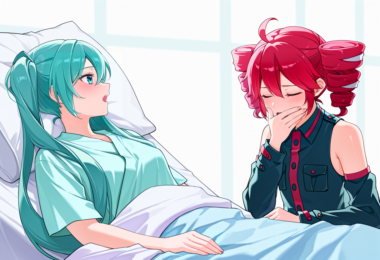触发词:角色1,枕头,被子下,张开嘴,躺着,角色2,坐着,用手捂住嘴,手遮住嘴