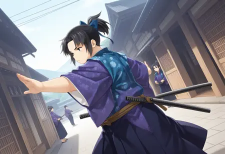 blue hair_bow, japanese clothes, green_haori, haori sleeveless, purple yukata, brown sash, blue hakama, white socks, sandals,