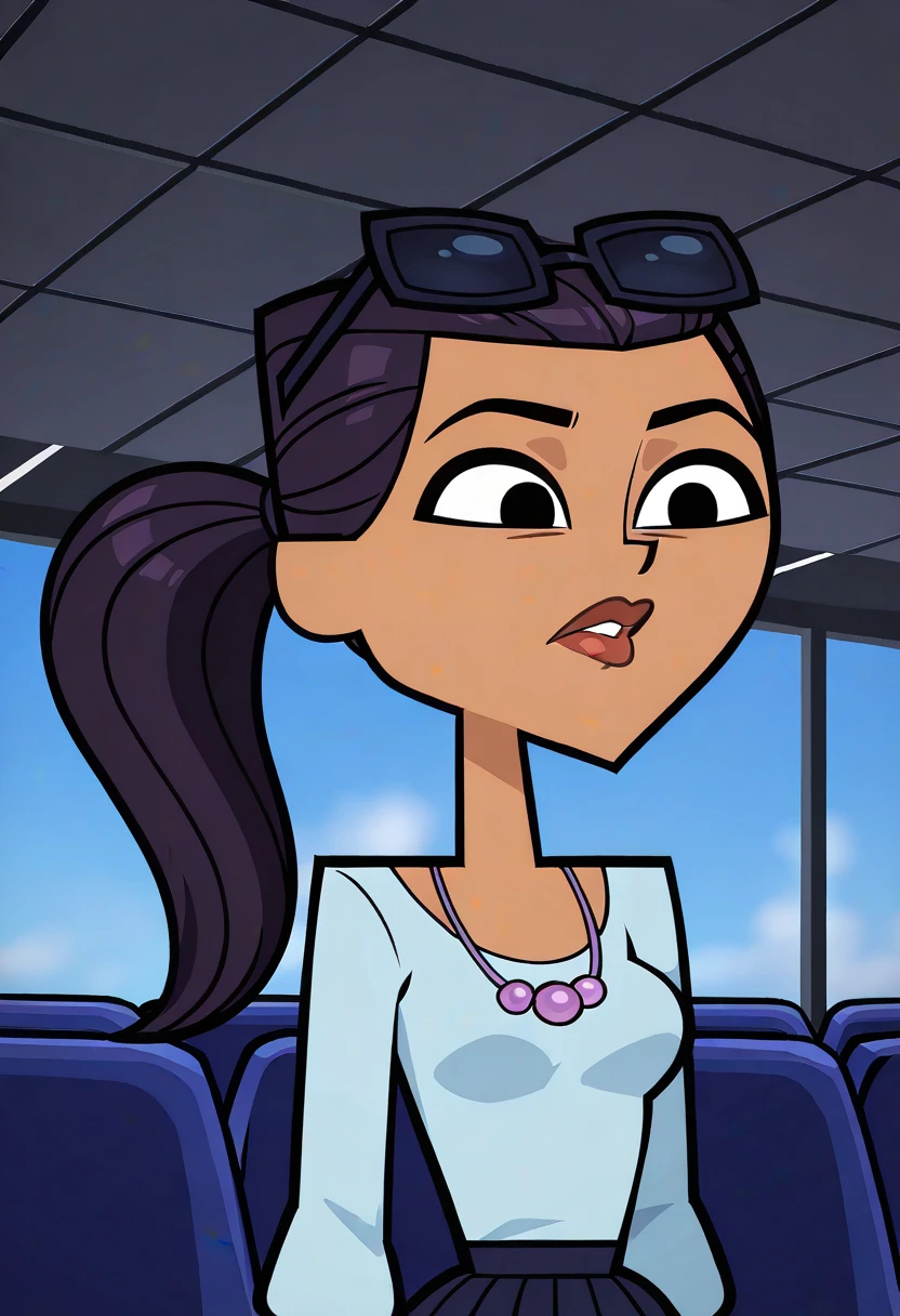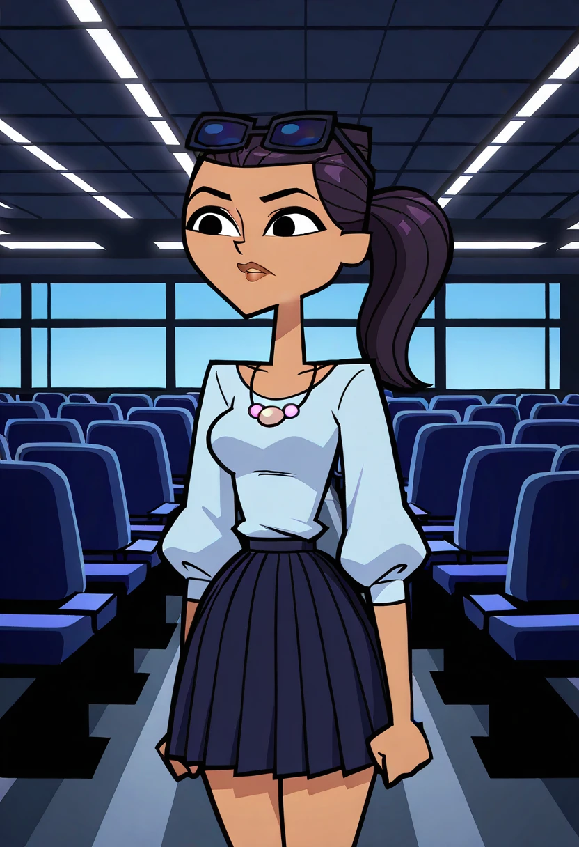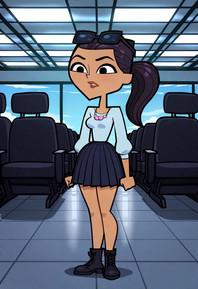 JenTDRR, 1girl, tan skin, light blue top, dark blue pleated skirt, black sunglasses resting on head, light purple necklace, black-purple hair, high ponytail, dark black boots, lips, big lips, black eyes,