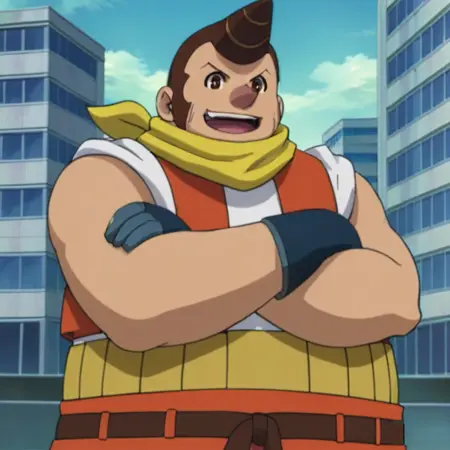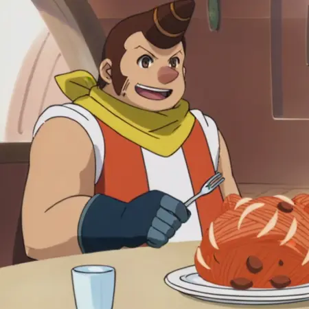 Prompts: male, fat, brown hair, sideburns, brown eyes, yellow scarf, white shirt, vest, sleeveless, gloves, belt, pants, boots, holding, handheld game console (for Link Gate), indoors (restaurant/table/plate/spaghetti/food/cup), indoors (cave), indoors (office), outdoors (quarry), outdoors (city/building/vending machine/television/tree/cloud)