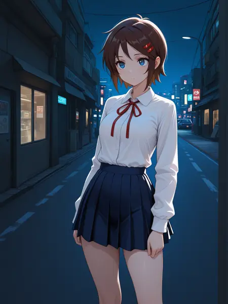 outfits: white shirt, long sleeves, skirt, red neck ribbon,white socks ,loafer,