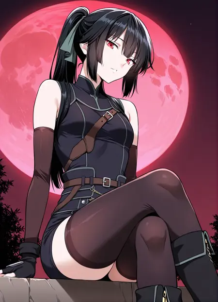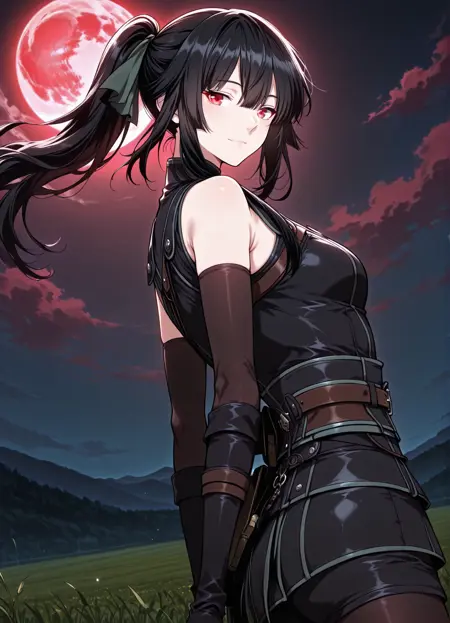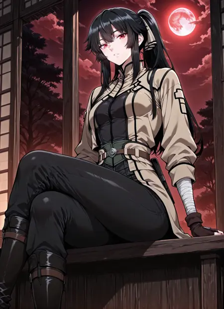 1 girls, solo, red eyes, black hair, long hair, ponytail, bangs, hair between eyes, sidelocks, small breasts