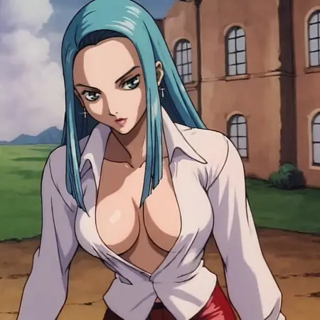 带白衬衫的触发词:MorriganWhiteShirt, 1girl, 开襟衬衫, 大胸, 露衣, 长发, 红裤子, 蓝发, 无胸罩, 耳环, 蓝眼, 珠宝, 长袖, 深V领, 西部镜头