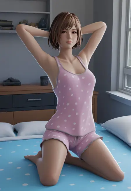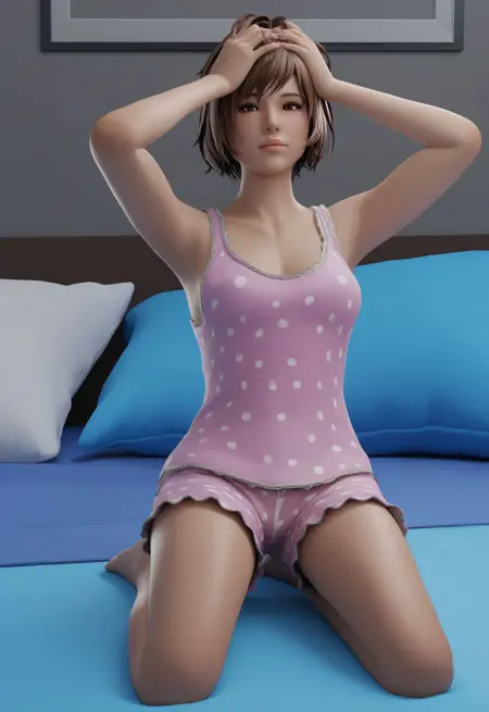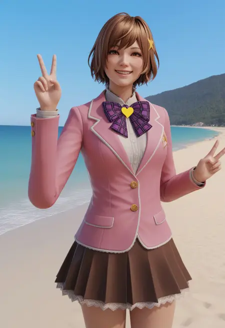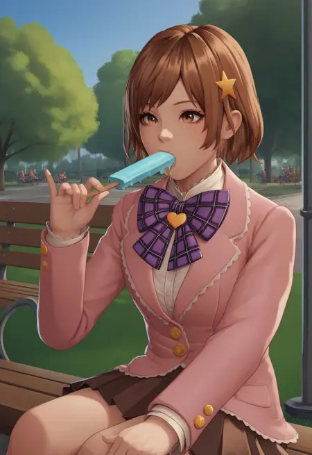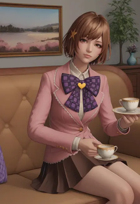 The energetic assistant of Mondo from Killer is Dead. I also trained her sleepwear outfit, so if you want to use those, use the secondary triggers. Her star hairpin occasionally duplicates/mirrors, so you might want to add a smaller weight to fix it (star hairpin: 0.8).