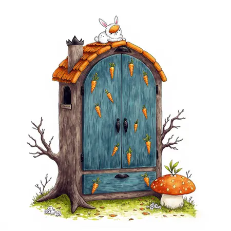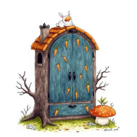 示例:<lora:gmic icon _F1_Healing game scenesv4:1>,zeqa avatar_/(avatar/),Game item ICONS,ICONS,game art,still life,White background,[Moonlight Rabbit Wardrobe] The domed treehouse wardrobe is inlaid with glow-in-the-dark carrot door rings,the cabinet is painted with glow-in-the-dark stickers of the silhouetted rabbit wearing a nightcap,and the spring mushroom stool pops out when the double doors are opened. The inner hanger is shaped like curved rabbit ears,and the bottom drawer pulls together to make a carrot savings bank,which has petals falling every time it is opened and closed.,