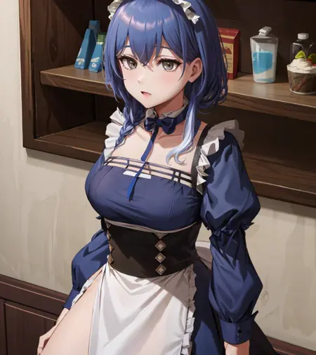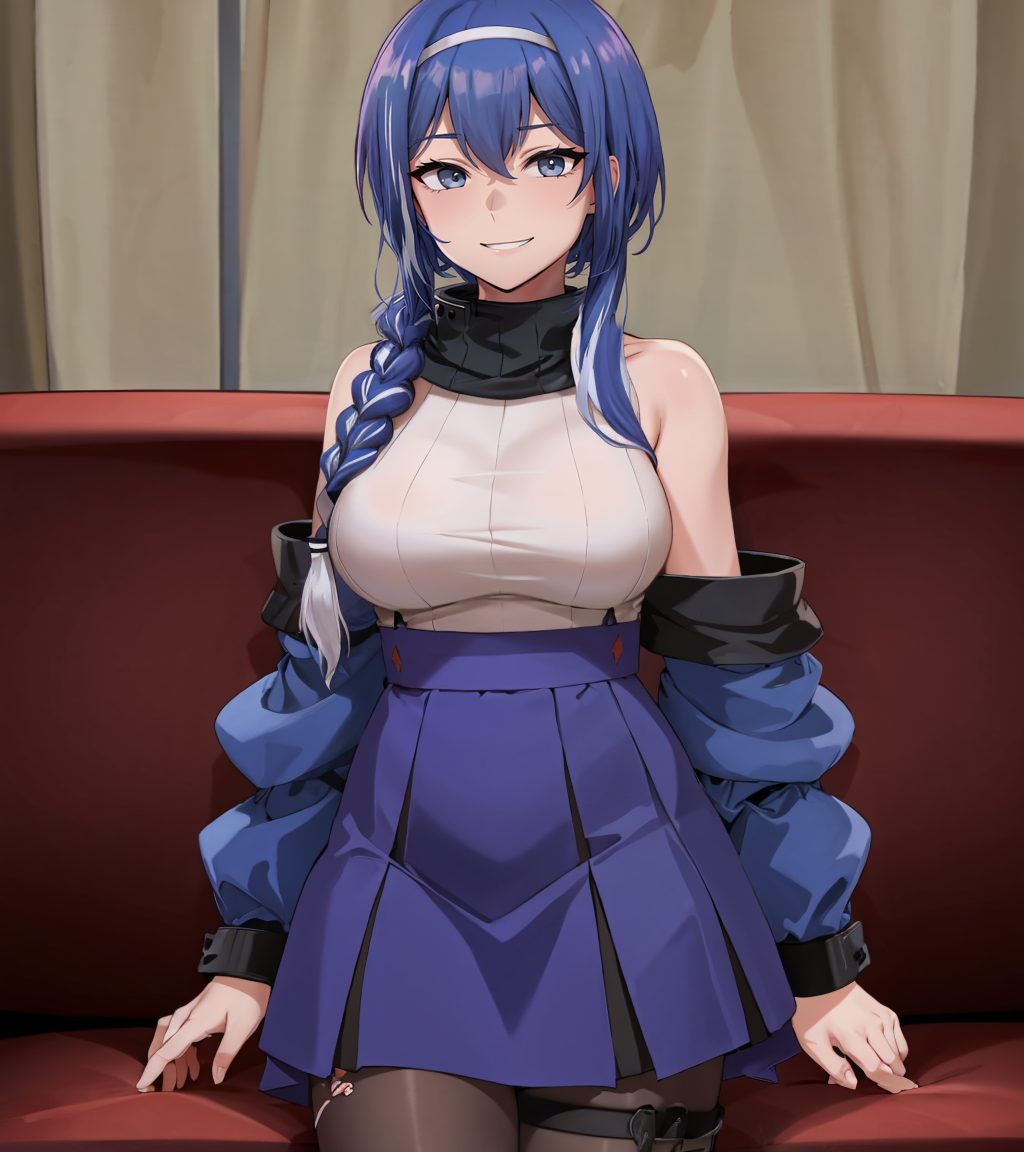 DP12Normal,高领毛衣,无袖设计,裸露肩部,辫子,发带,蓝色裙子,丝袜,大腿绑带,丰满胸部,黑色夹克