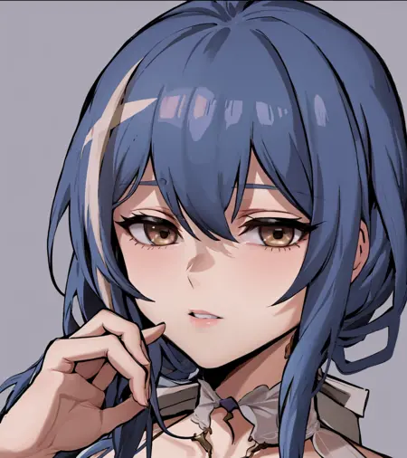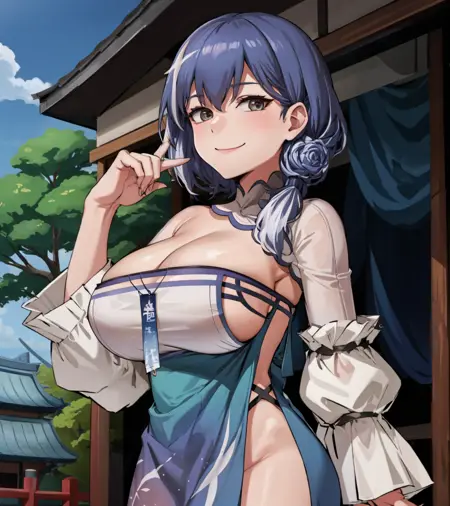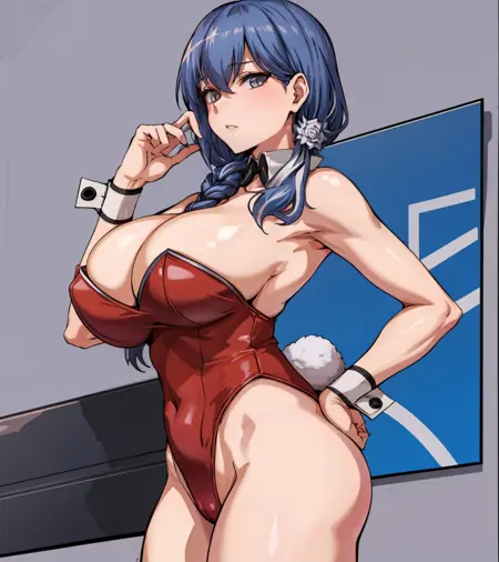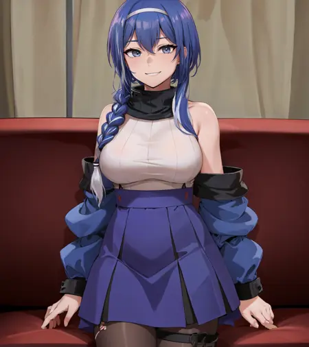 DP12Normal, turtleneck sweater, detached sleeves, bare shoulders, braid, hairband, blue skirt, pantyhose, thigh strap, large breasts, black jacket