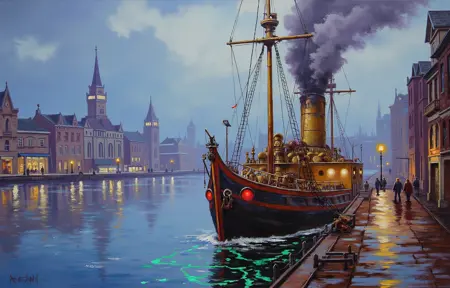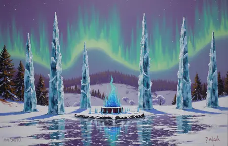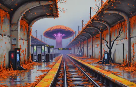 例:Oil painting, Oil painting style,,廃棄されたガスステーション・核塵の黄昏、砂嵐で磨かれて光り輝く錆びたガスポンプと、「地球上の最後のガス」と書かれた褪せた看板。黄昏の中、壊れたネオン管がけいれんのように点滅し、油タンカーは横転して液体を漏らし、その液体は虹色の結晶に凝縮されている。見張り塔のてっぺんの風見鶏は動かず、空は不健康なオレンジ色~茶色に変わり、歪んだ三日月が放射状に広がる雲の間からのぞいている。