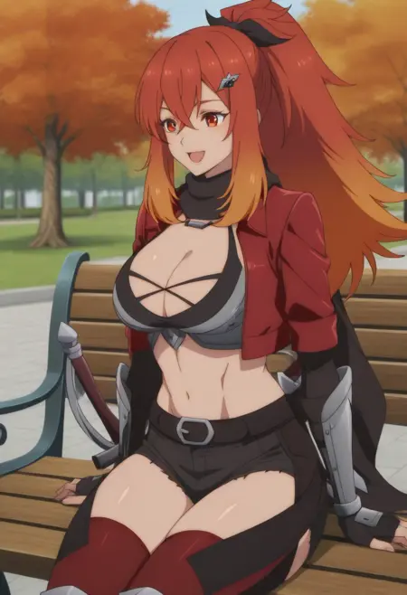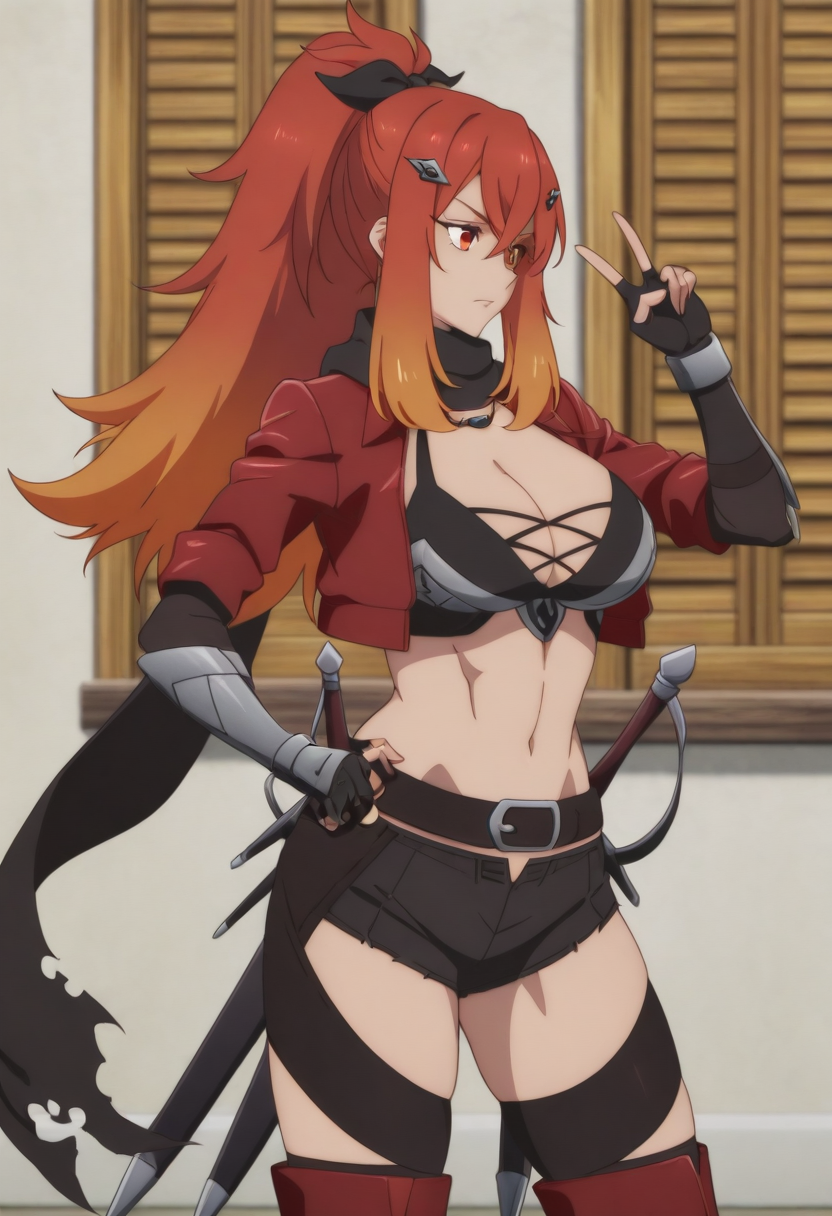 트리거 = zzsurenalysandrazz, 태그 = 1girl, solo, multicolored hair, long hair, red hair, breasts, red jacket, orange hair, gradient hair, jacket, weapon, large breasts, sword, cleavage, gloves, ponytail, scarf, thighhighs, navel, fingerless gloves, shorts, hair ornament