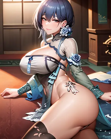 DP12dress、大きな胸、ハイヒール、髪飾り、肩にかかげる髪、中国ドレス、透ける素材