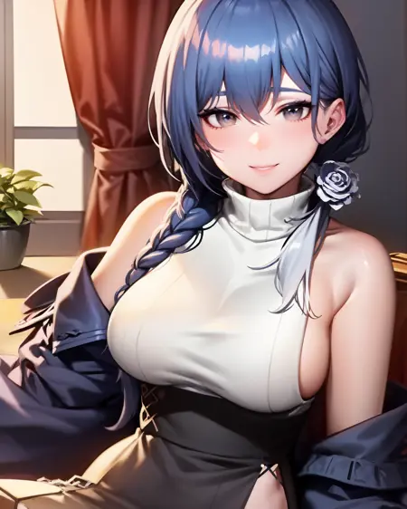 DP12Normal, 반목테 니트 셔츠, 탈부착 가능한 소매, 벌거벗은 어깨, 두줄 땋은 머리, 머리밴드, 파란 치마, 팬티스타킹, 대퇴부 스트랩, 큰 가슴, 검은 자켓