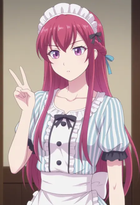 Trigger = zzoukamakuzawazz, Tags = long hair, 1girl, solo, braid, purple eyes, red hair, maid headdress, pink hair, short sleeves, ribbon, hair ribbon, shirt, striped, standing, apron, white apron, collarbone
