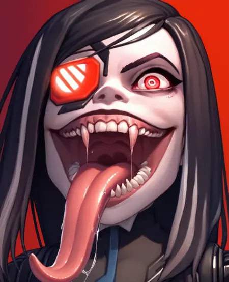 매우 날카로운 이빨 또는 흡혈귀 이빨을 가짐 - 미소, 또는 벌어진 입, 긴 혀