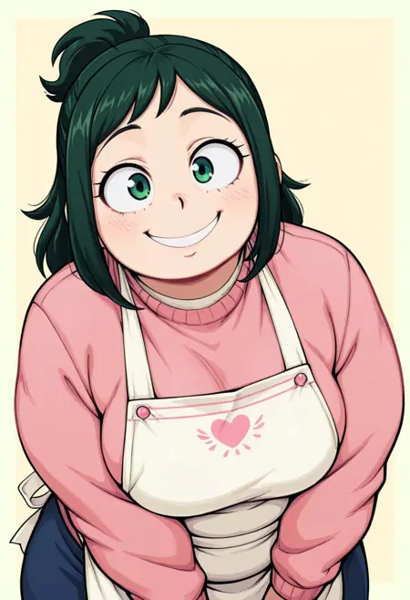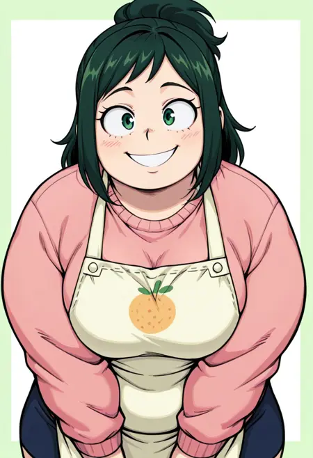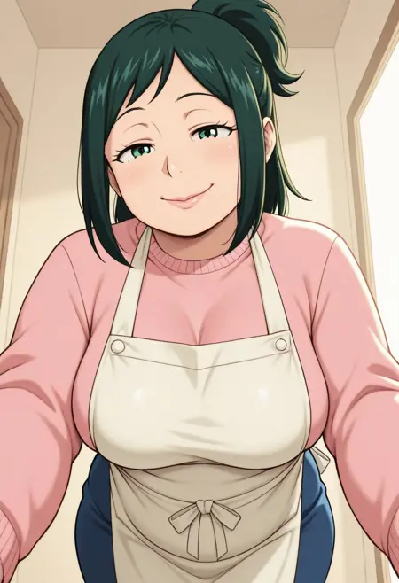 태그: inkomidoriyaILL, 성인 여성, 약간 통통한 체형, 녹색 머리카락, 녹색 눈, 꼬리머리, 치마, 분홍색 스웨터, 앞치마,