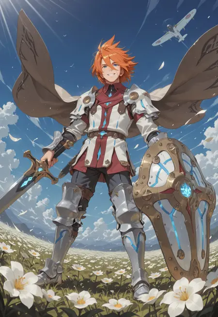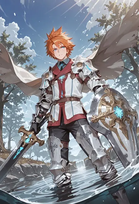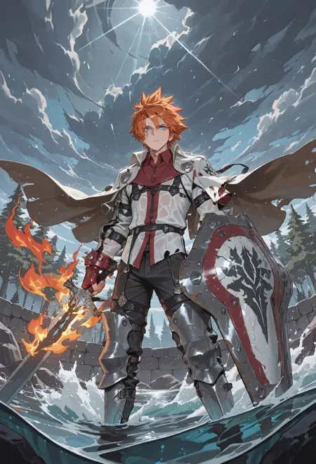 collared shirt, long sleeve shirt, cape, armor, shield, sword, boots,