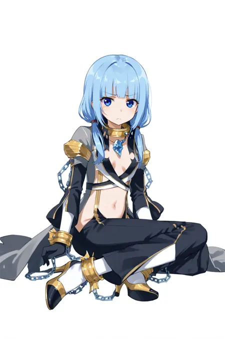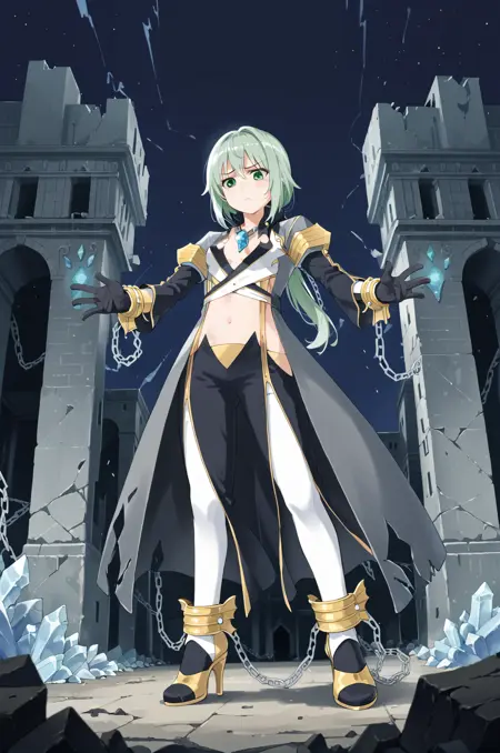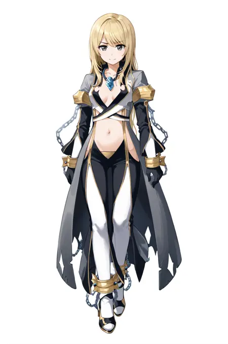 prompt: warlockRO, chain, chained wrists, navel, gloves, midriff, gem necklace, clothing cutout, center opening, black gloves, shackles, white sleeves, grey coat, pants, frown, collar, white legwear, high heels