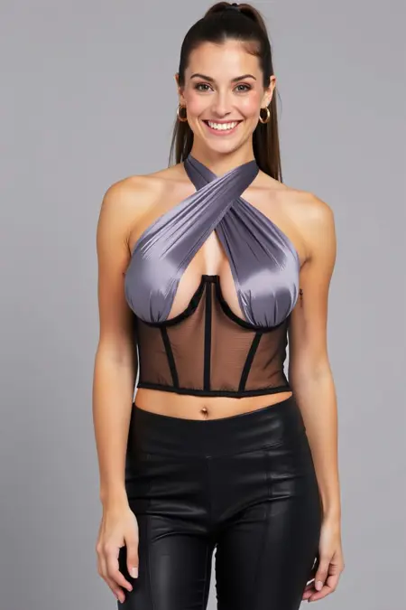 尝试不同的提示(裁剪、束腰、交叉吊带等)。