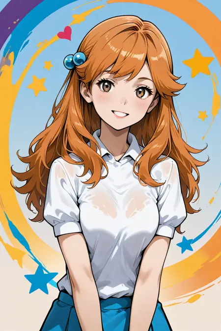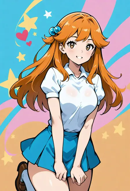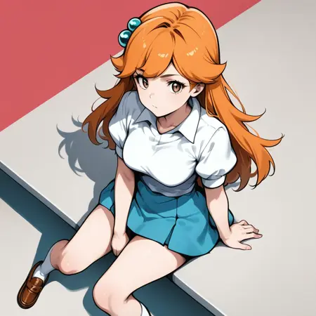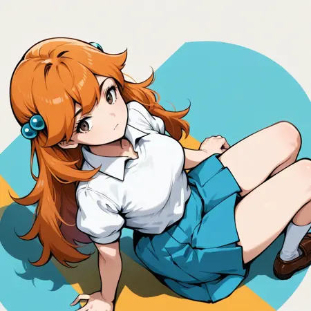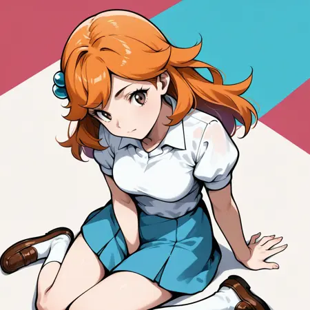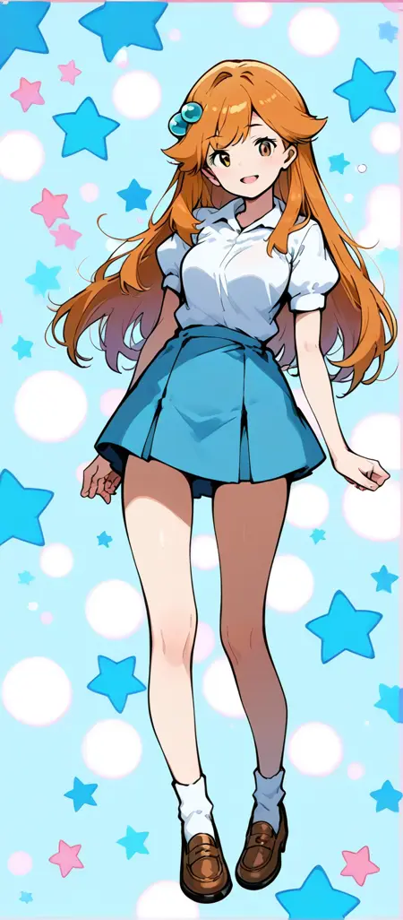 lassfrlg, brown eyes, orange hair, long hair, bangs, hair bobbles, white shirt, collared shirt, short sleeves, puffy sleeves, blue skirt, pleated skirt, miniskirt, white socks, loafers, brown footwear