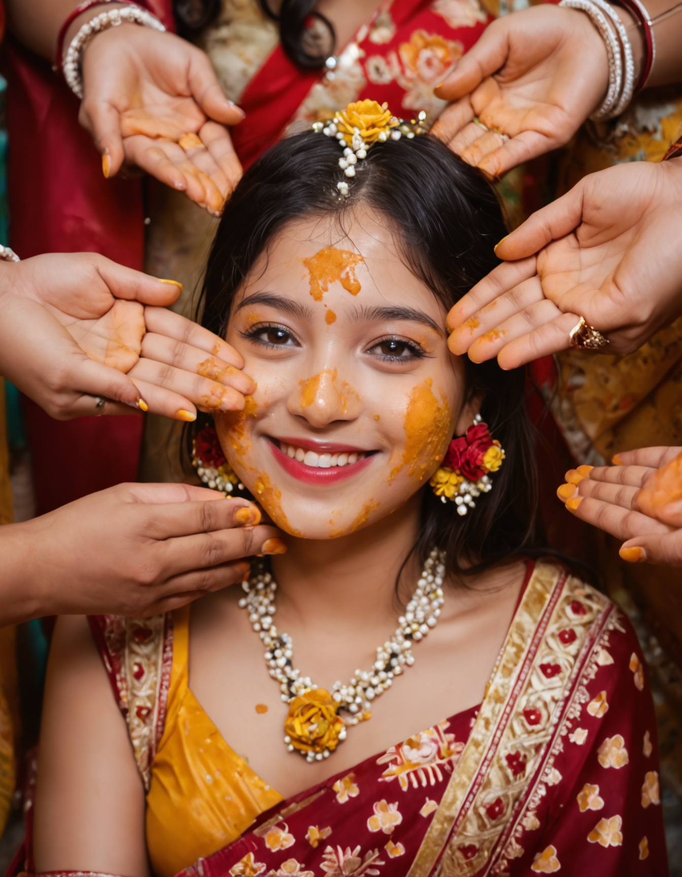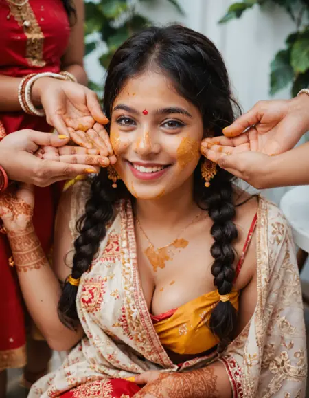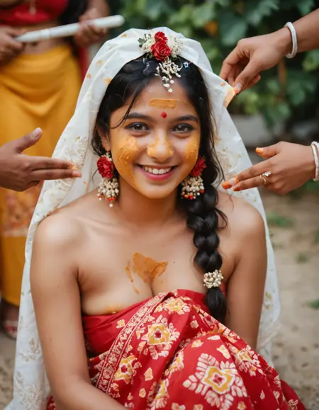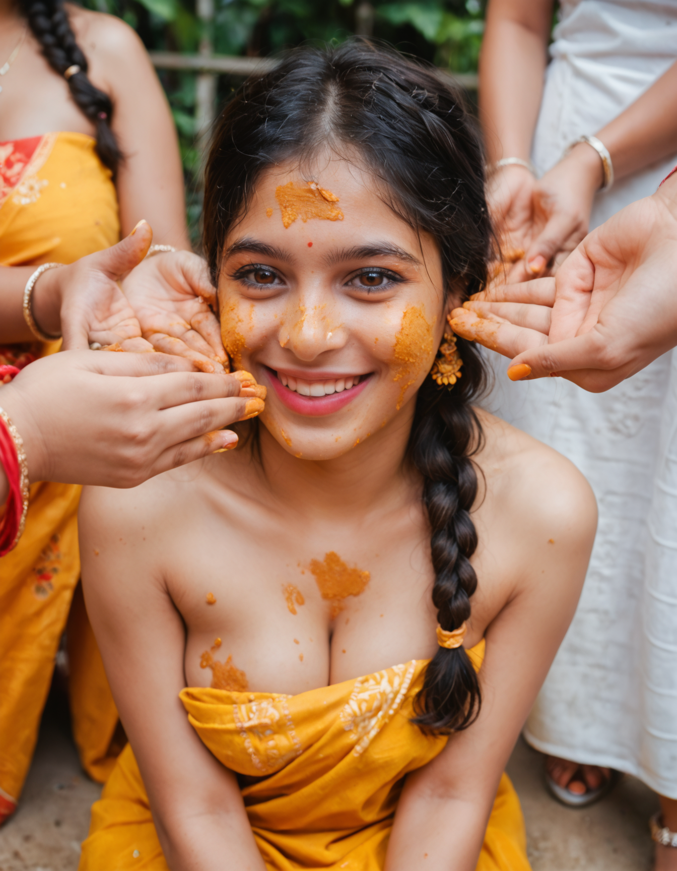 这是我尝试创作的哈迪仪式场景。这是印度婚礼前的一种传统仪式,用姜黄、檀香木及其他成分制成的糊状物涂抹在新娘和新郎身上(有时仅涂抹其中一人)。