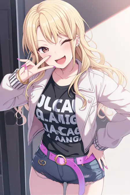 touko, 1girl, solo, long hair, blonde hair, brown eyes, looking at viewer, smile, shorts, jacket, jewelry, necklace, hand on hip, shirt, hood, collarbone, short shorts, casual