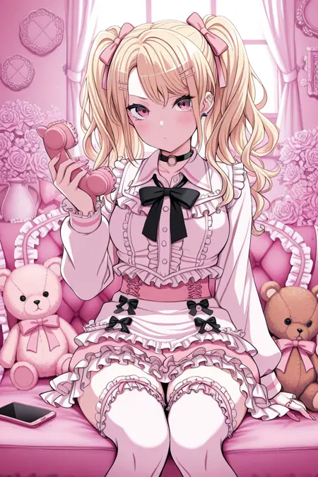 touko, 1girl, gloves, solo, blonde hair, hat, black gloves, earrings, long hair, looking at viewer, white headwear, jewelry, hand on hip, smile, skirt, brown eyes, aiguillette, onstagesk