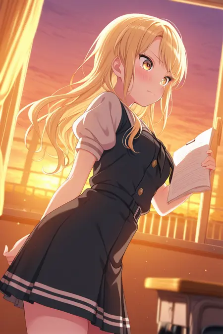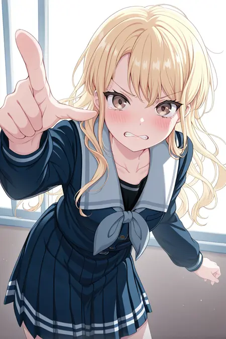 touko, 1girl, blonde hair, solo, long hair, school uniform, skirt, pleated skirt, smile, brown eyes, serafuku, blue skirt, looking at viewer, collarbone, tsukinomori school uniform