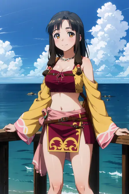 댄스 복장도 시도해 볼 수 있지만, 여러 에포크를 시도해 봤지만 애니메이션처럼 잘 나오지 않네요 :/ 프롬프트: "팔찌, 허리, 아라비아 복장, 댄서, 투명, 금장식, 파란 목걸이, 왕관, 베일"