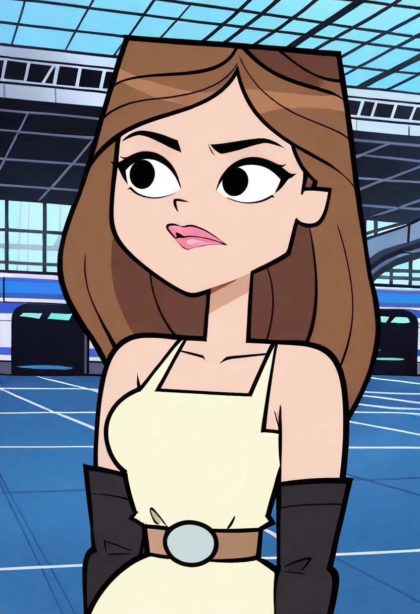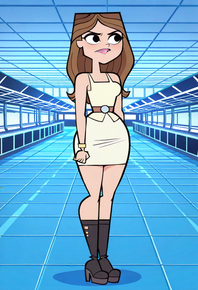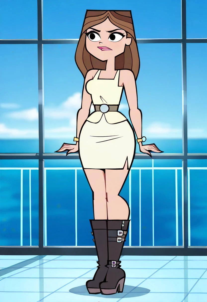 TaylorTDRR, 1girl, long brown hair, light yellow dress, light brown belt, black high boots, pink lips, lipstick, big lips, black eyes,