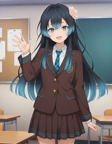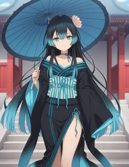 <lora:carmilla-yami_healer_s1-ixl-anime-soralz:1>, carmilla (yami healer), long hair, gradient hair, black hair, blue hair, hair flower, sidelocks, blue eyes, (green eyes:0.8)