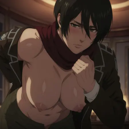 " source_anime, anime screencap, masterpiece, absurdres, high quality, detailed skin, detailed character design, ultra-high resolution, perfectly composed, clear, breathtaking attention to detail, highres, ultra detail, indoors, soft shadows, detailed textures, intimate atmosphere, warm glow, reflective surfaces, BREAK 1girl, female focus, mikasa_akcerman, red scarf, black hair, short hair, hair between eyes, black eyes, closed mouth, looking at viewer, white shirt, collared shirt, chest harness "