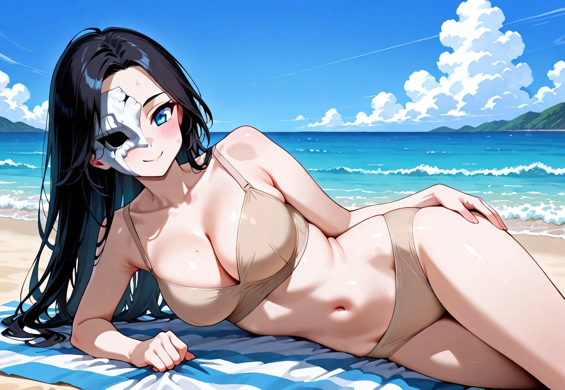 外見: 1girl, solo, 黒髪, 長髪, マスク, 白いマスク, ハーフマスク, アイマスク, 空のアイマスク, 黒いヘッドバンド, 青い目, 胸元, 大きな胸,