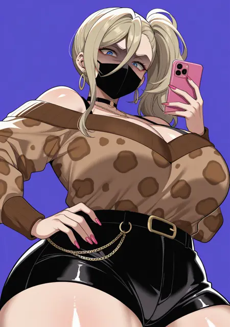 "动物纹路,长袖,露肩,黑色短裤,项圈,耳环,项链"
