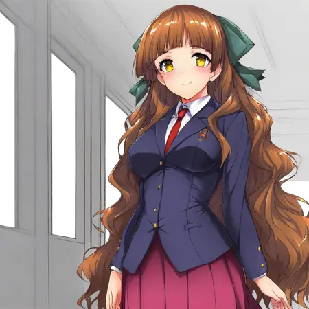 新宮ゆうり:YuuSBR、黄目、茶髪、ブレンドの前髪、波状の髪、長い髪、ヘアボウ、緑のリボン
