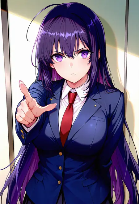 制服(エンジェルアカデミーを基に):angeaca、青いジャケット、白いインナーシャツ、赤いネクタイ、長袖