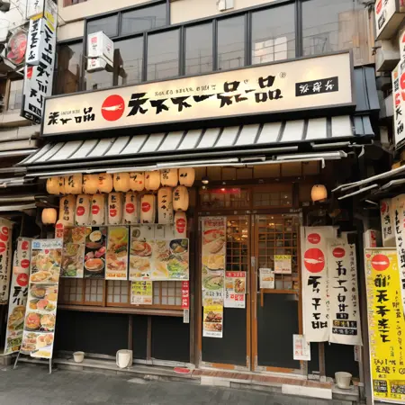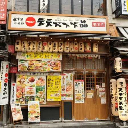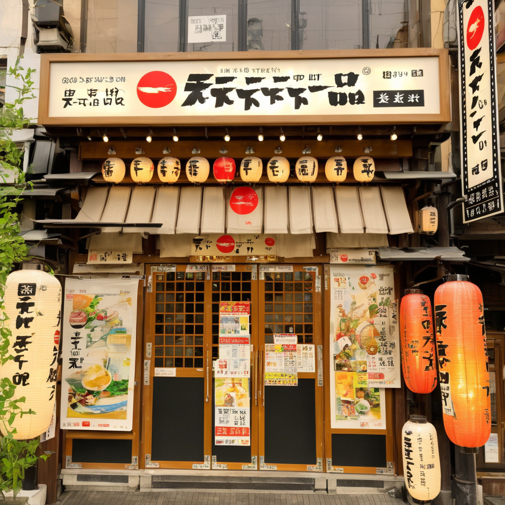tenkaippin, poster (object), scenery, sign, shop, lantern, outdoors, road, street, paper lantern, window, food, storefront, door, building, night, pavement, lamp, lamppost, realistic, photo background, photo (medium)