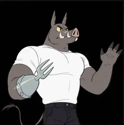 Helpful Prompt: boar snout, fur, yellow sclera, black eyes, eyebrows, (fork as hand)