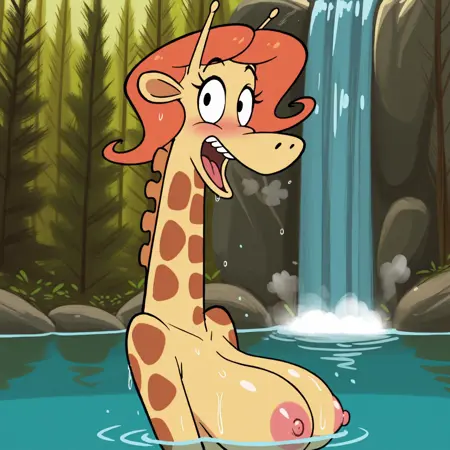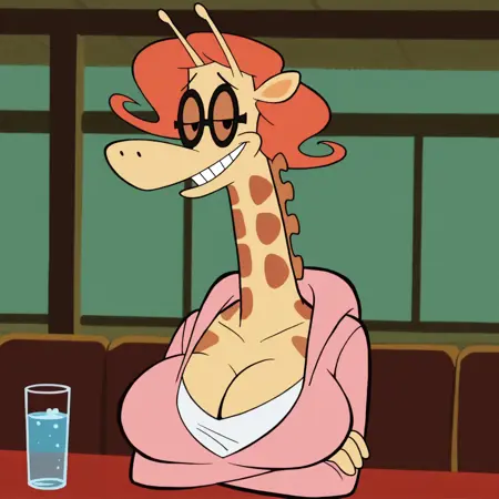 ポジティブプロンプト: NinaCL、フューリー、アンスロ、女性フューリー、キリン、オレンジ色の髪、黒色の眼鏡、茶色のレンズ、黒い目、黒い眉、細い眉、黄色い体、茶色の斑点、尾、細い腕、細い脚
