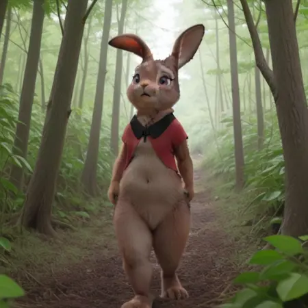 FlopsyRbbt18il, semi-anthro, female, rabbit_girl, brown fur, brown eyes, red shirt black trimmed collar