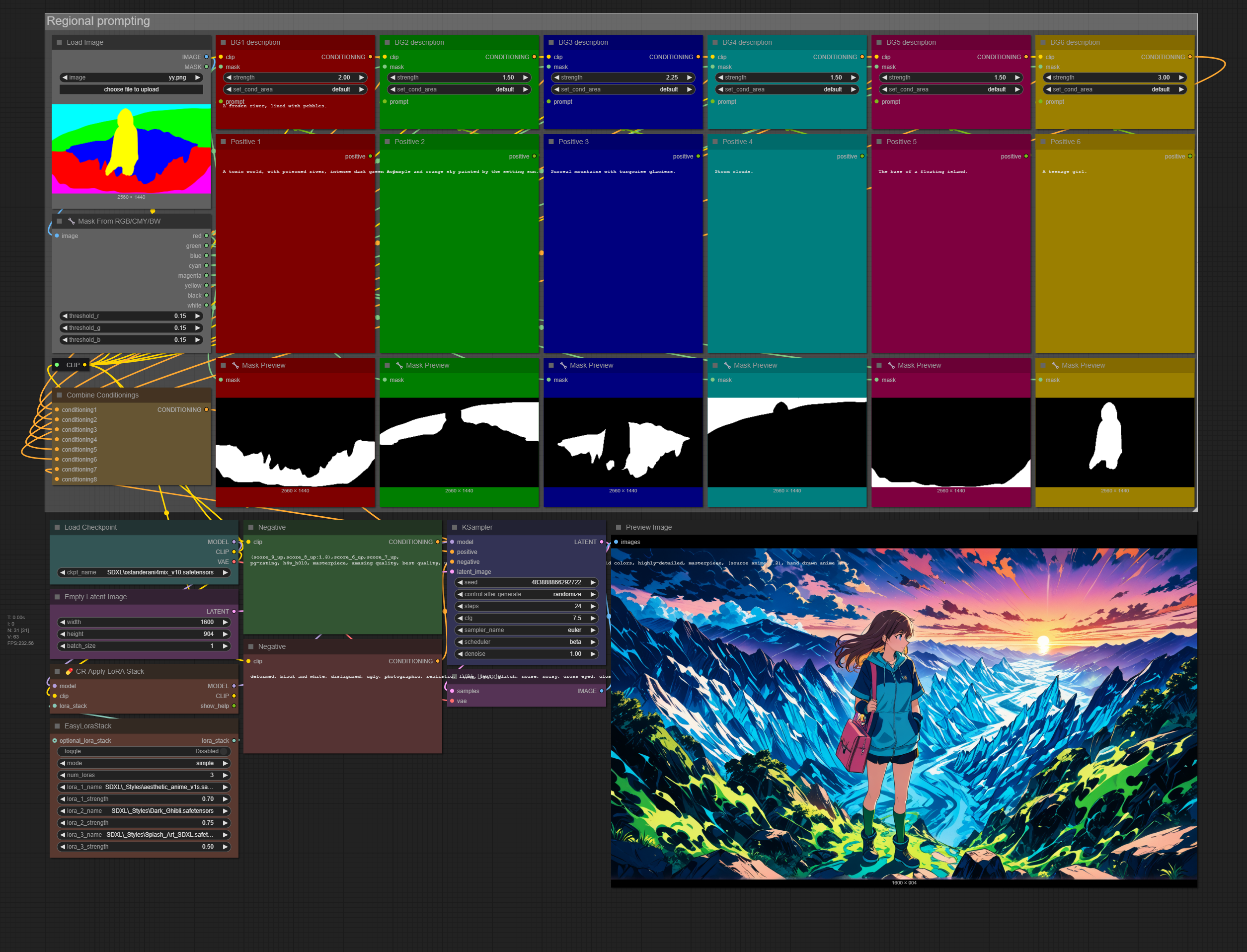RGBCYM 색상 마스크를 사용한 영역 프롬프팅을 위한 간단한 워크플로우, 최대 6개의 서로 다른 영역.