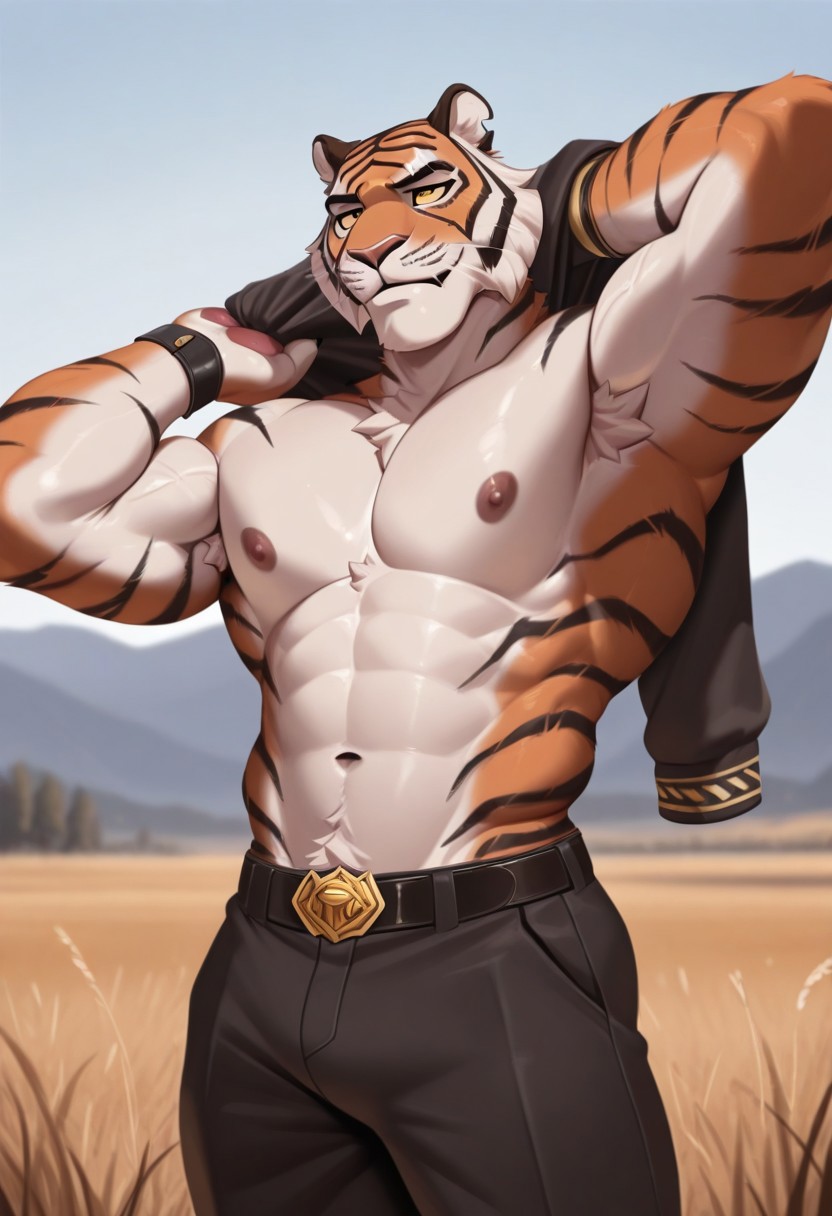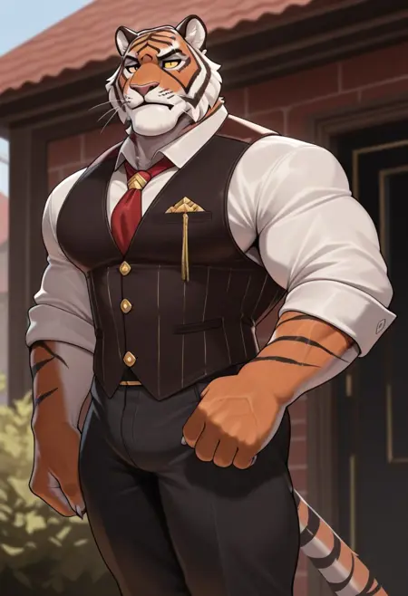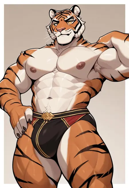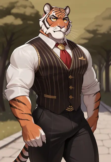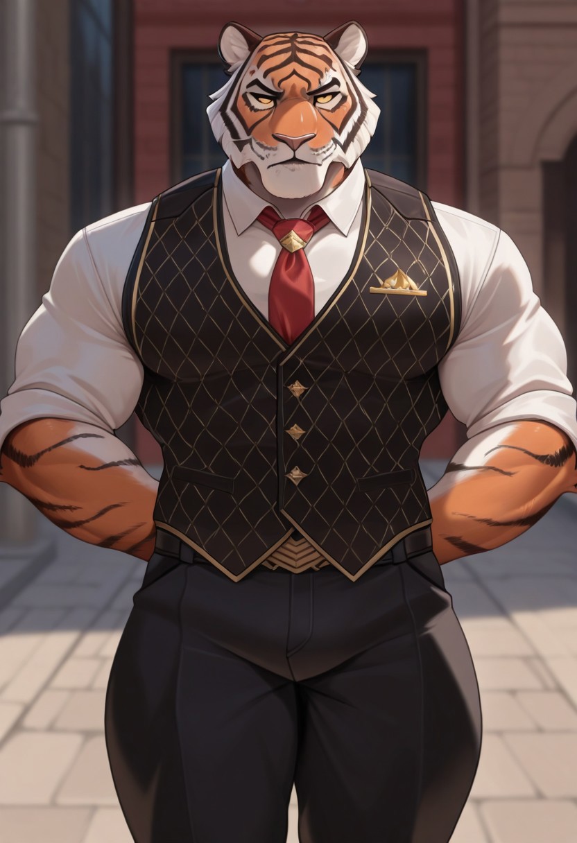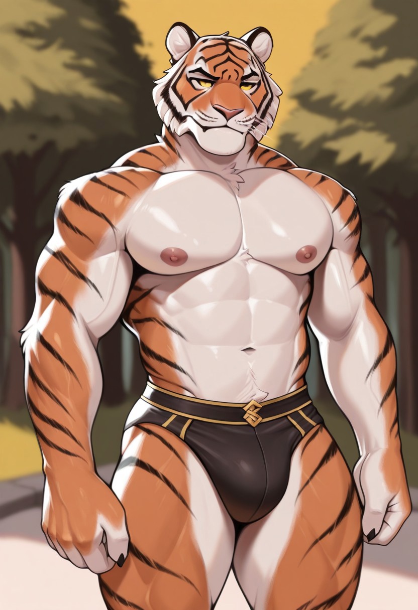 Anthro,tiger,Oscar,yellow sclera,black pupil,orange fur,black marks,muscular male,tiger ears