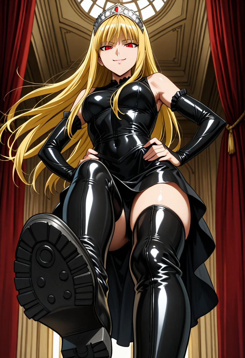 long hair, blonde hair, red eyes, bare shoulders, collarbone, sidelocks, frills, detached sleeves, black dress, tiara, anime coloring