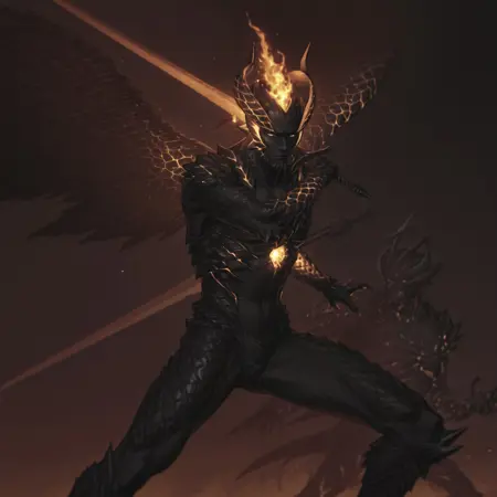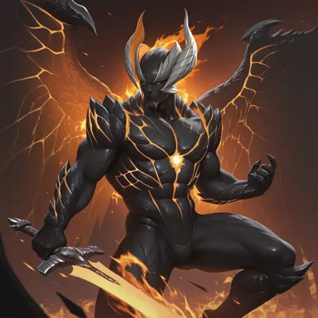 附加标签: 怪物,角,翅膀,黑皮肤,发光,爪子,獠牙,手持武器,