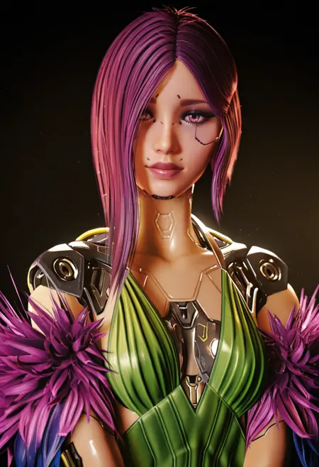 彼女の外見を維持したい場合、以下を追加してください:cyberpunk girl, cybernetic implants, purple hair, robotic arms