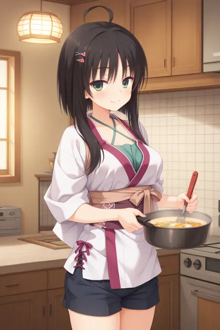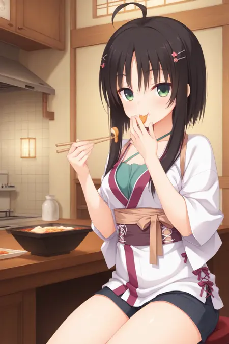 aamako, 緑の目, 黒髪, 長い髪の束を伴う短髪, ahoge, 髪止め, makocasual, 日本服, 白い着物, 短い着物, 緑のシャツ, 交差型ハーネス, 茶色の帯, 帯, 黒いショートパンツ,