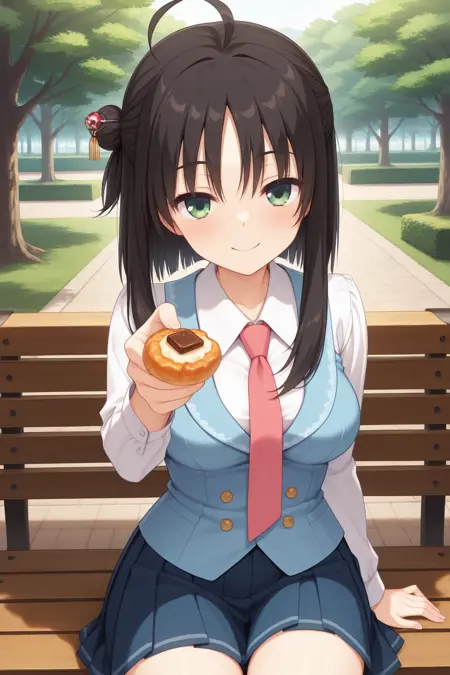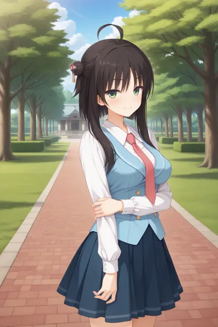 ddmako, 緑の目, 黒髪, 長い髪の束を伴う短髪, 片側の結び目, ハーフアップ, ahoge, 髪止め, makodate, 白いシャツ, 青いベスト, 長い袖, ピンクのネクタイ, 青いスカート, プリーツスカート,