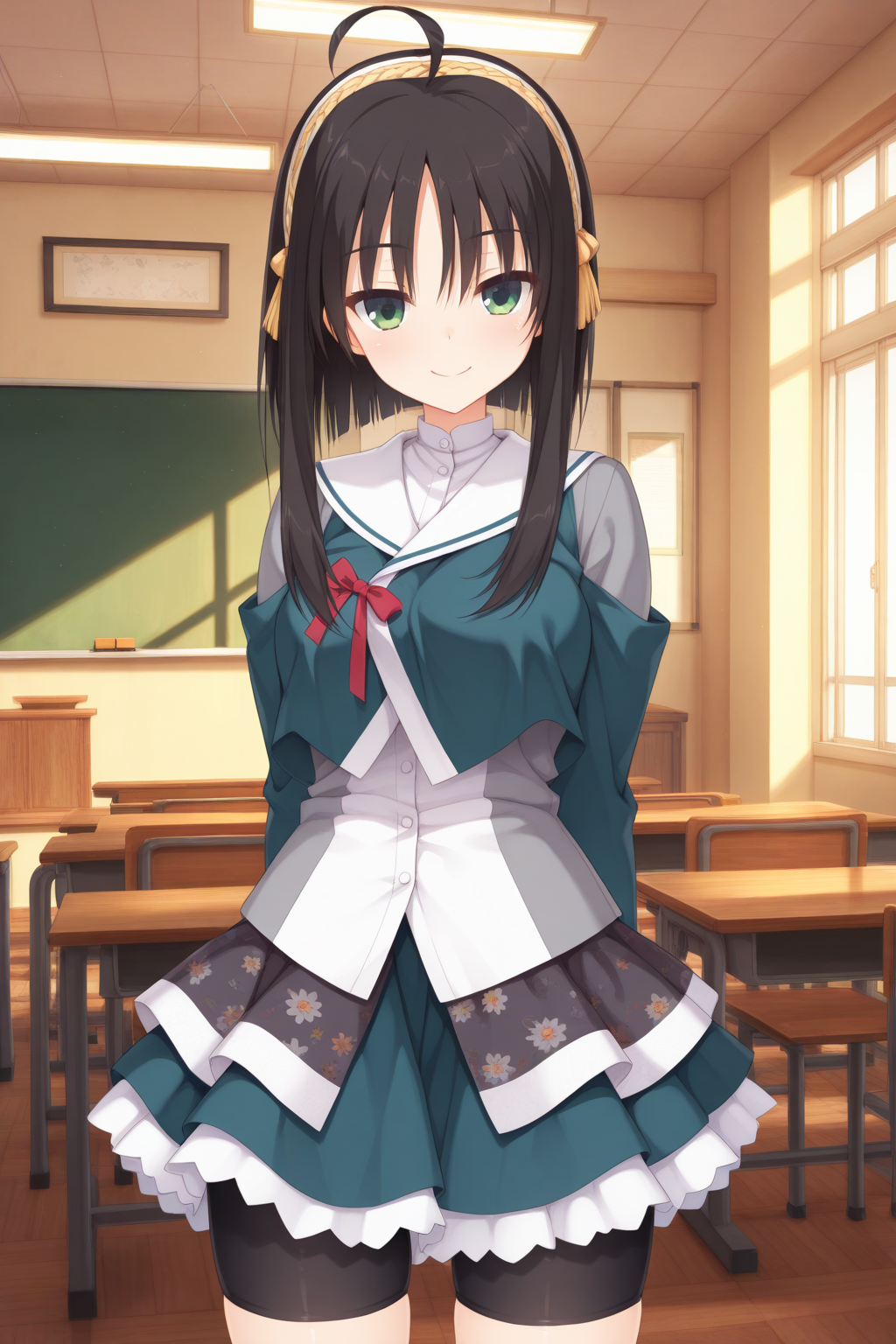 ccmako, 緑の目, 黒髪, 長い髪の束を伴う短髪, ahoge, 黄色の髪留め, makoschool, 学校制服, 白いセーラー衿, 緑のジャケット, 短めのジャケット, 赤いリボン, 長い袖, 白いシャツ, 緑のスカート, 重ねたスカート, 灰色のスカート, プリントスカート, スカート下の自転車用ショートパンツ,