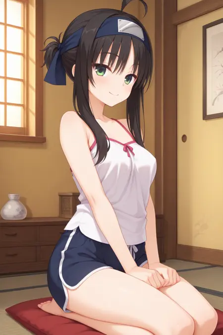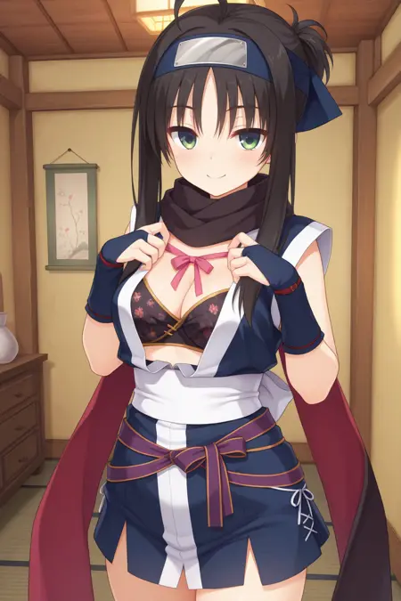 bbmako, 緑の目, 黒髪, 長い髪の束を伴う短髪, 短いポニーテール, ahoge, makoninja, 日本服, 額当て, 二色スカーフ, 黒いスカーフ, 赤いスカーフ, 青い着物, 袖なし着物, ピンクのリボン, 黒いブラ, プリントブラ, 花柄プリント, 青い手袋, 指なし手袋, 白い帯, 紫の帯,